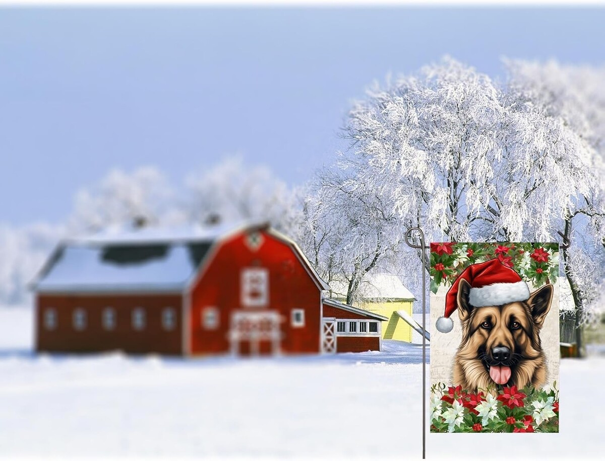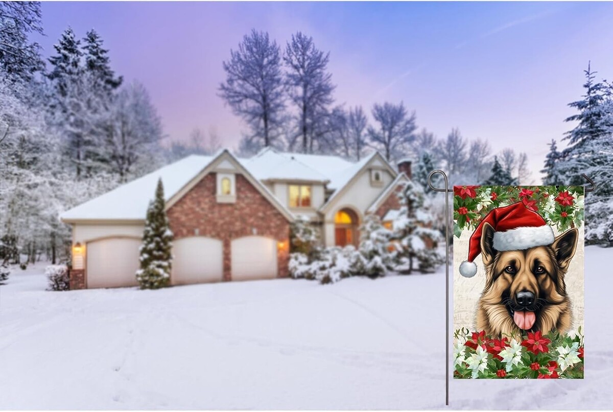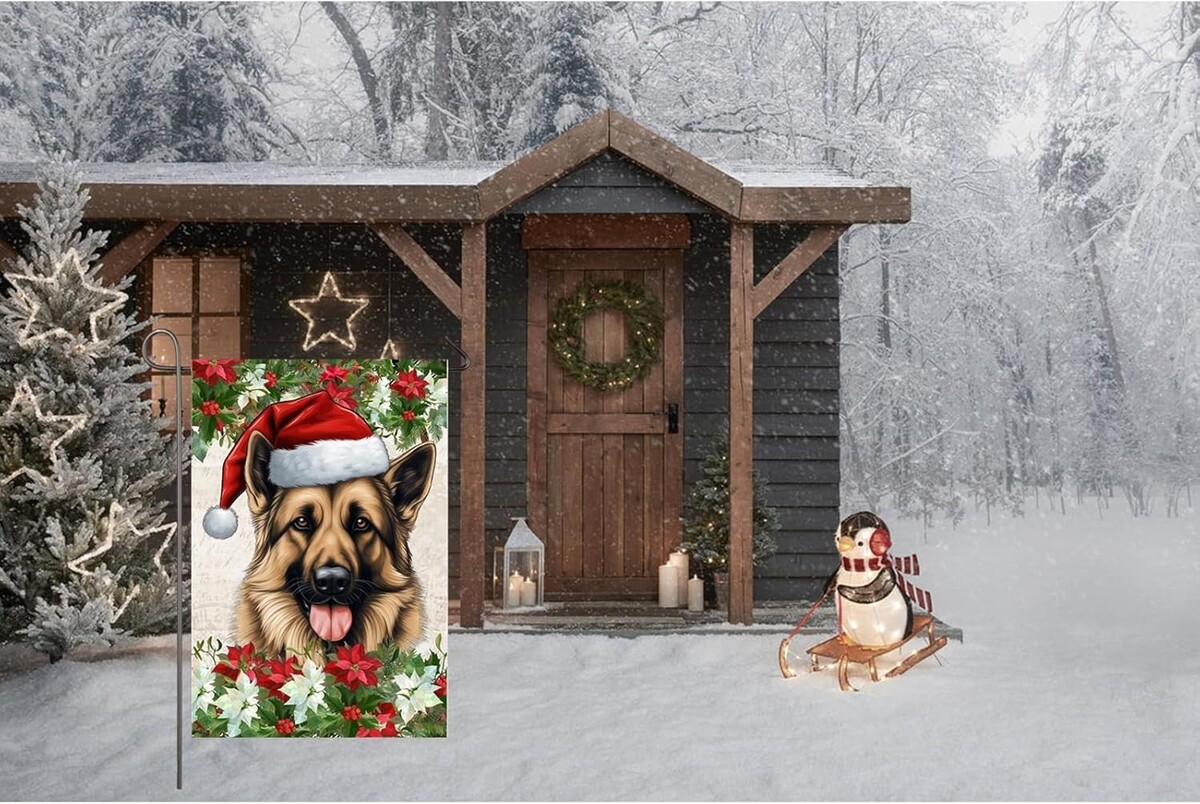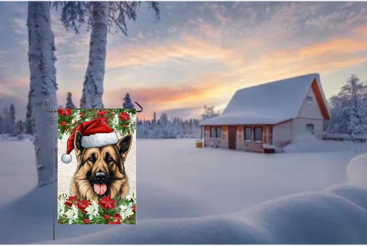 : Decorative garden flag is a good choice for home decor and adds a strong seasonal atmosphere. This christmas garden flag features a german shepherd dog wearing a christmas hat and poinsettia flowers on both sides. Perfect for adding color and beauty to your outdoor garden, yard, patio, front porch, farmhouse decor.