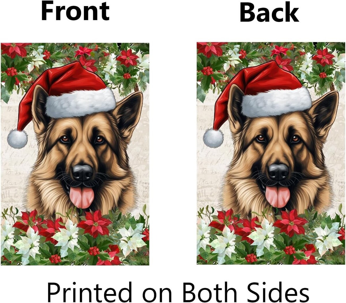 : The image and text of this german shepherd christmas garden flag is printed double sided. Its artistic image appears on both sides and words read correctly on both sides.