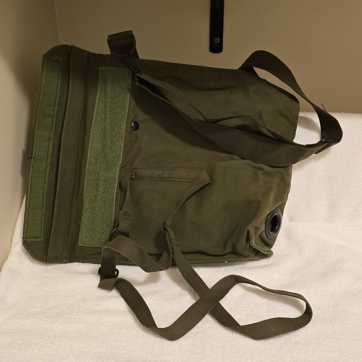Cotton canvas carrier for the military gas mask. Specifically for the aircraft style. Has a grommeted hole in the bottom to connect the oxygen tube.