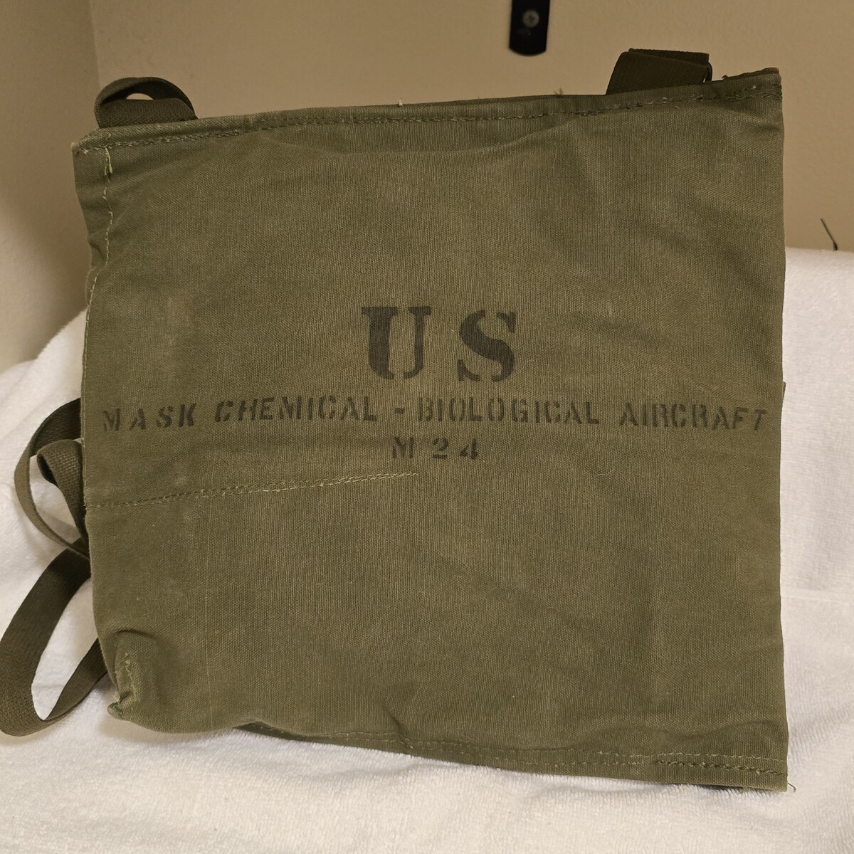 US Military M24 Aircraft Chemical / Biological Green Canvas Gas Mask Bag - Has been deployed to war / used. Bag closed dimensions: 12" x 13"