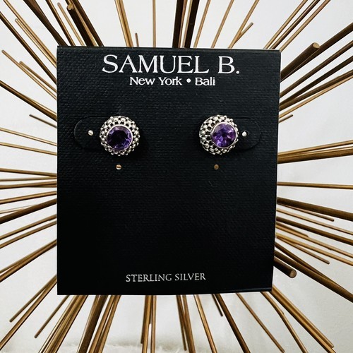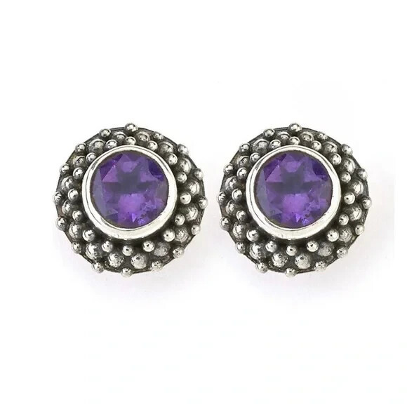 Samuel B. Sterling Silver Beaded Border Round Amethyst Stud Earrings, Silver NWT