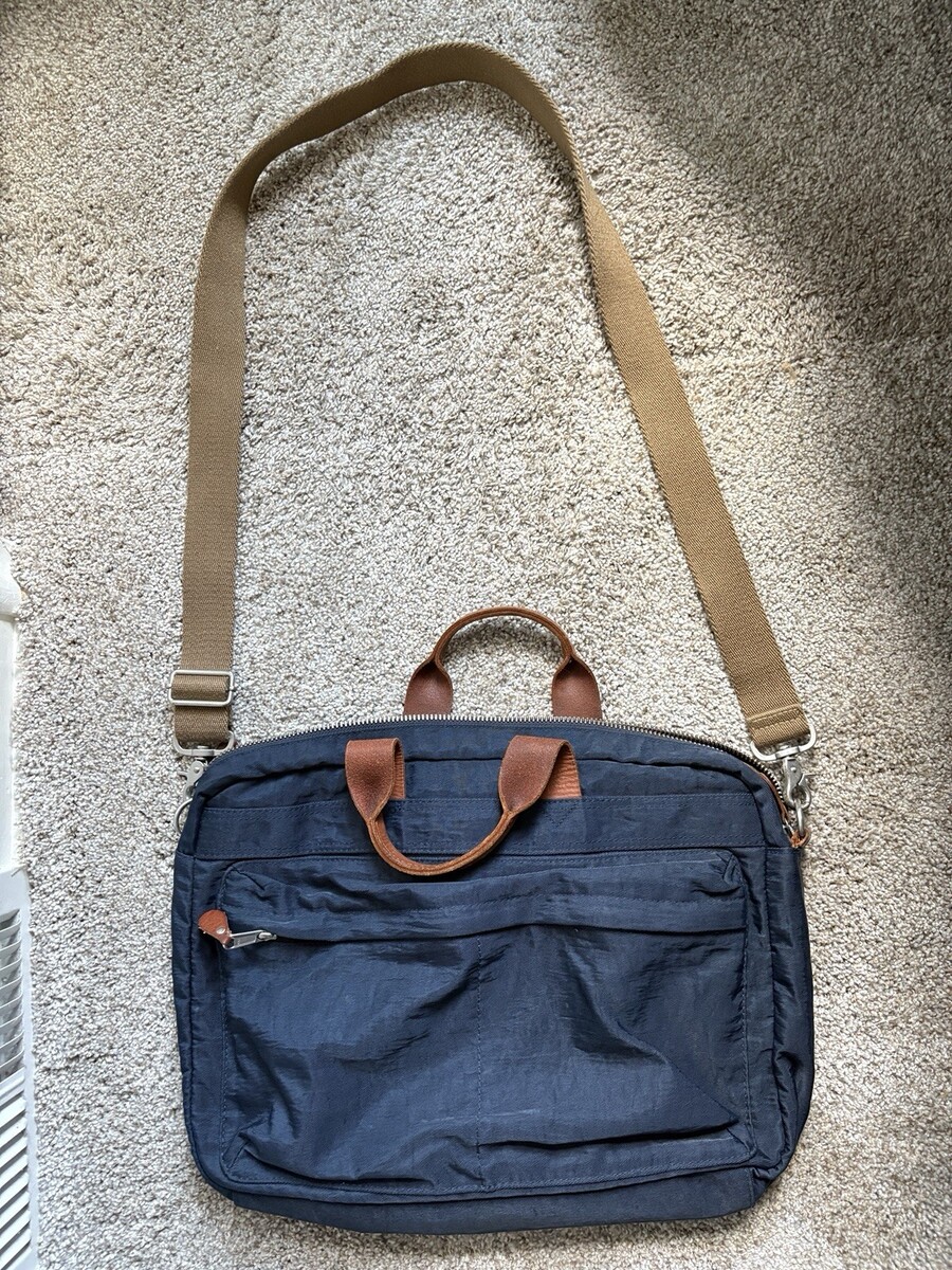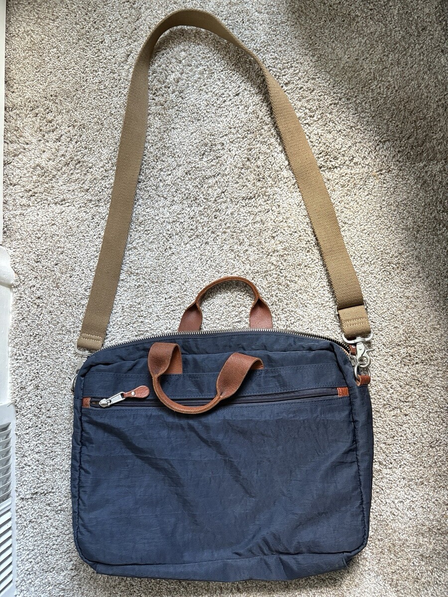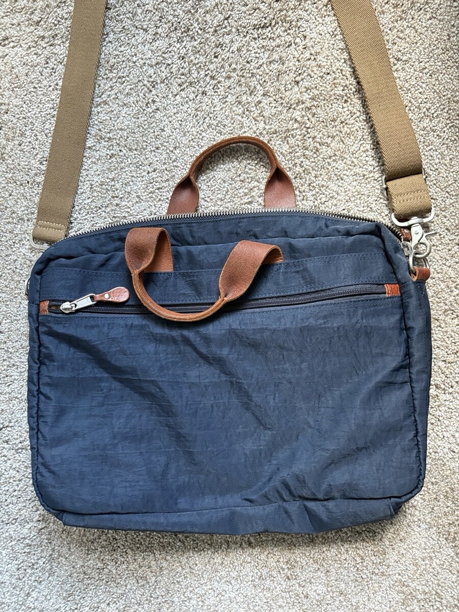The J. Crew Harwick Bag is a versatile tote designed for everyday use or business trips. Made from durable nylon with leather accents, this navy blue bag features a rectangular shape and double leather handles for easy carrying. The adjustable strap allows for added convenience, while the convertible design lets you switch between a tote or briefcase style. Perfect for those looking for a stylish and practical handbag that can transition from casual to professional settings.