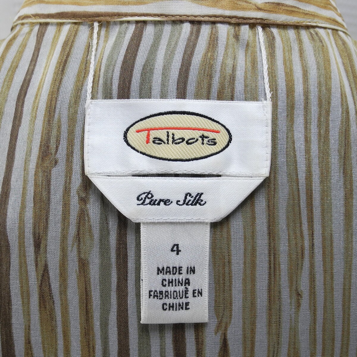 Elegant and timeless Talbots women?s blouse, size 4. Crafted from 100% silk with a sheer, lightweight finish, this piece features a vertical stripe pattern in beige, gold, and ivory tones. Perfect for the office, a dressy occasion, or stylish layering.