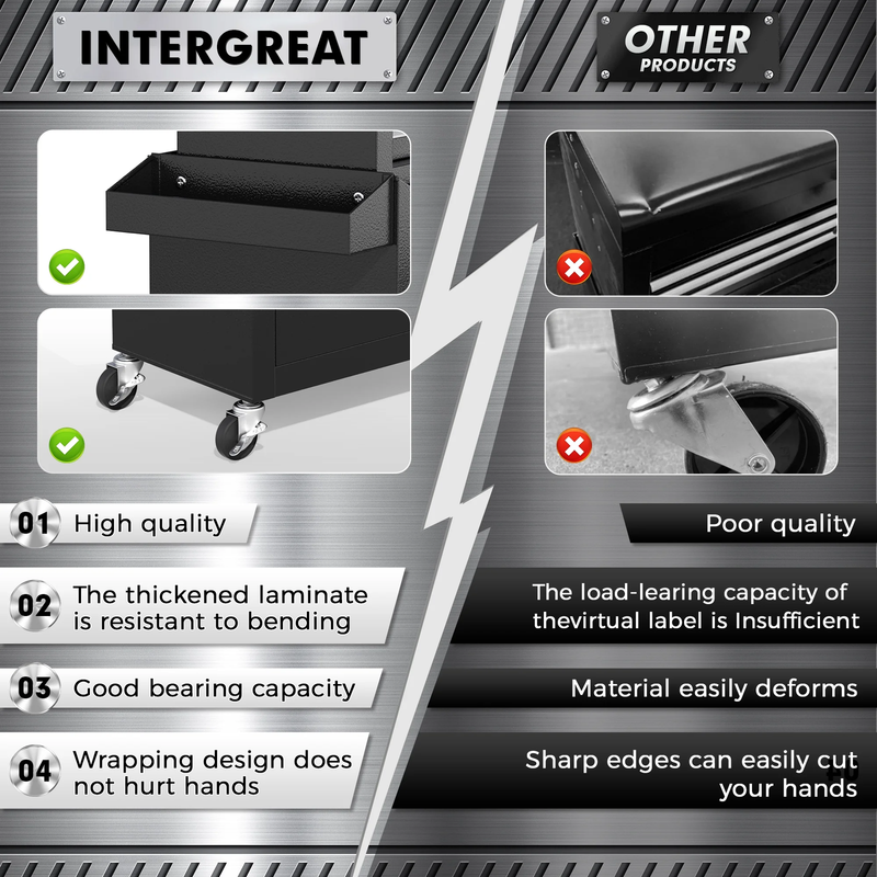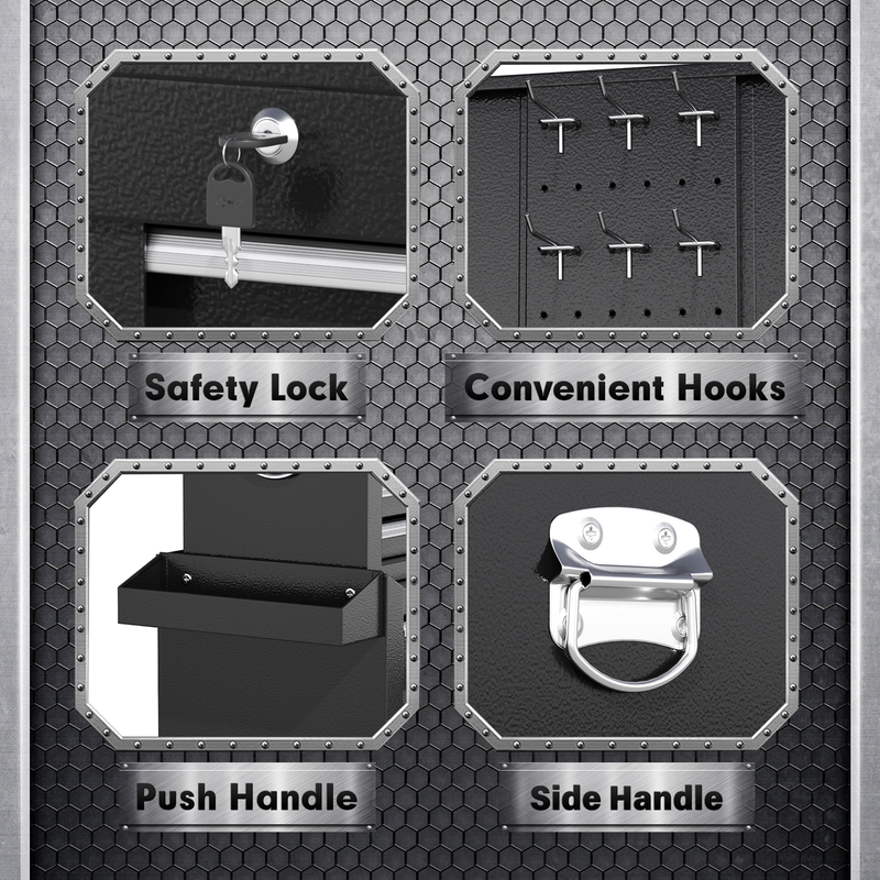 Secure Locking System Protective Liner - Two locking bars help to lock all drawers, tool tray and the bottom cabinet, and the locking buckle adds extra security. Meanwhile the top tool tray and 5 drawers have protective liners to prevent scratches and damage to tools.