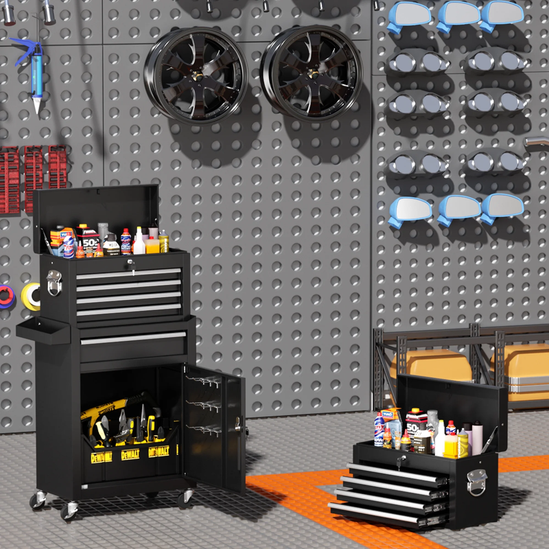Product Dimensions: 20.3"D x 11.8"W x 40.4"H Features a 2-in-1 design with a detachable toolbox that can be used separately or together Offers a large capacity for tool storage with a top tray, 5 drawers, and a spacious bottom cabinet Equipped with a secure locking system with two locking bars and a locking buckle for added security Includes protective liners in the top tool tray and drawers to prevent scratches and damage to tools Designed with universal and lockable wheels for easy mobility and stability Constructed from heavy-duty cold-rolled steel for strong load-bearing capacity and durability