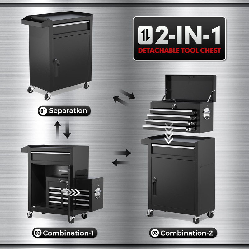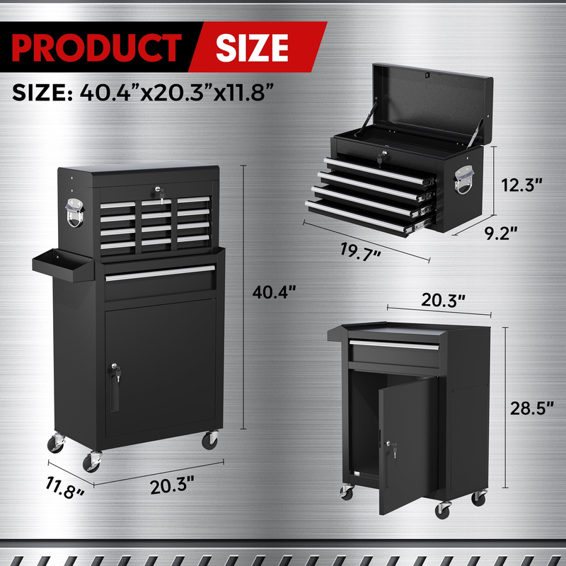 2-In-1 Design with Detachable Tool Box - Suncrown Overall Dimension: 20.3" x 11.8" x 40.4" (L x W x H) The tool cabinet can be separated into a 4-drawer tool box and a rolling tool cabinet, which can be used separately or together according to your needs. Besides, the top tool box can also be stored inside the bottom cabinet to save space.