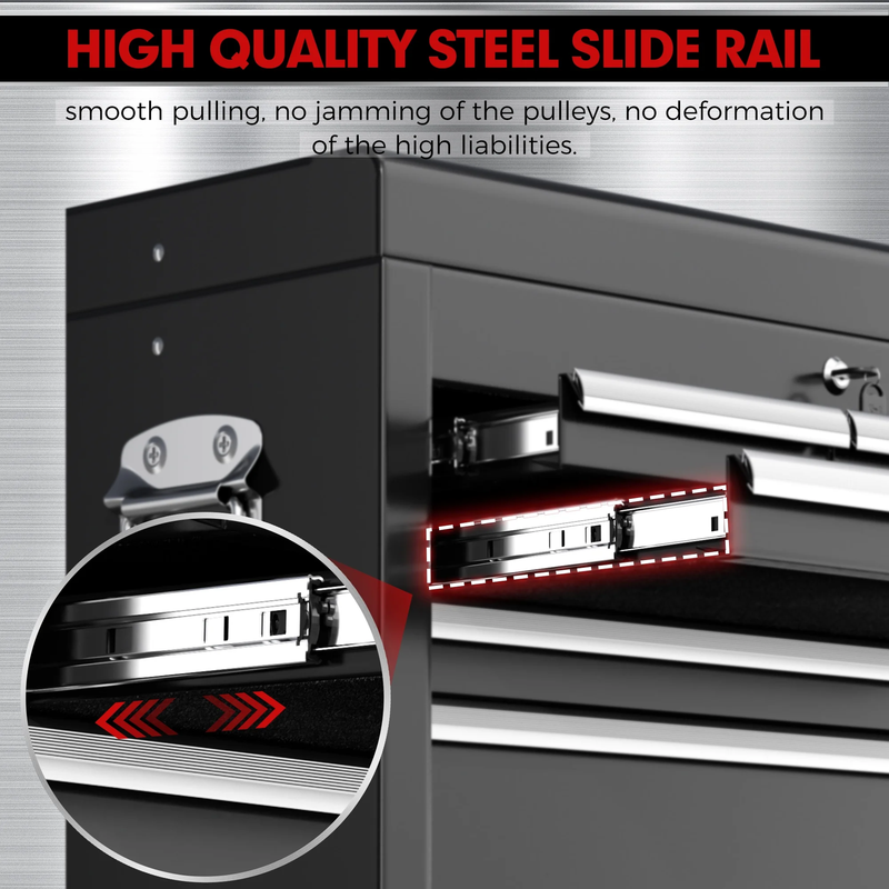Universal Lockable Wheels -The pull handle and 4 universal wheels make it easy to move the rolling tool chest around. What's more, 2 of the wheels are lockable to ensure that the tool box stays in place.