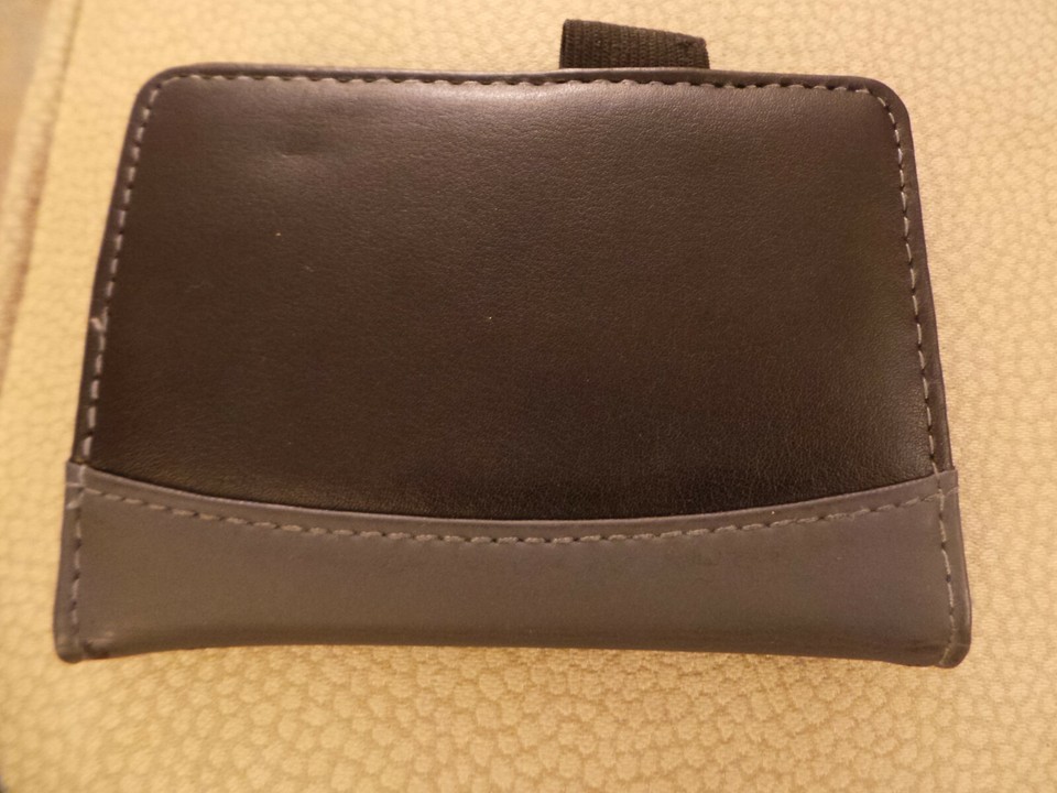 functional item .. fits easily in sport jacket or suit pockets, ladies handbags etc. Black and gray faux leather with tight pocket on the