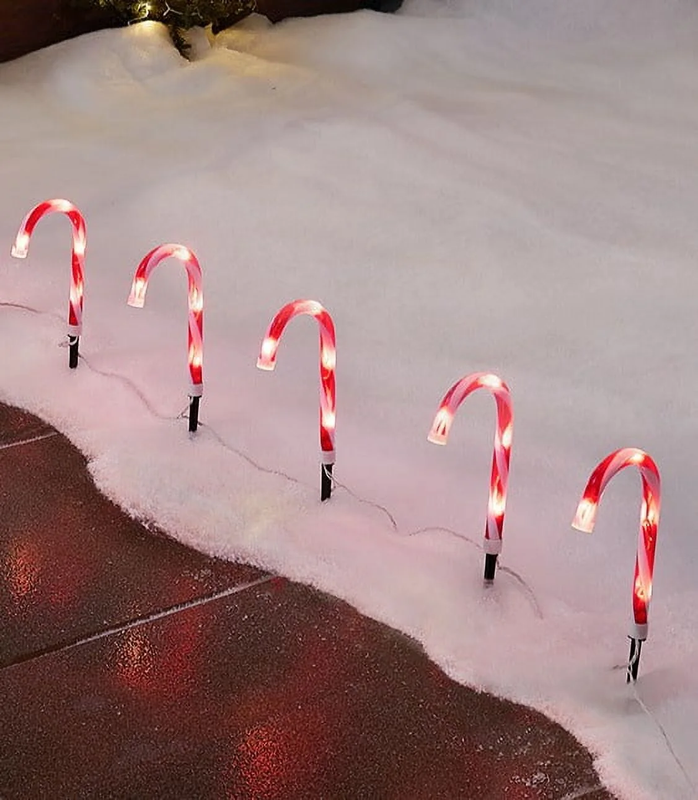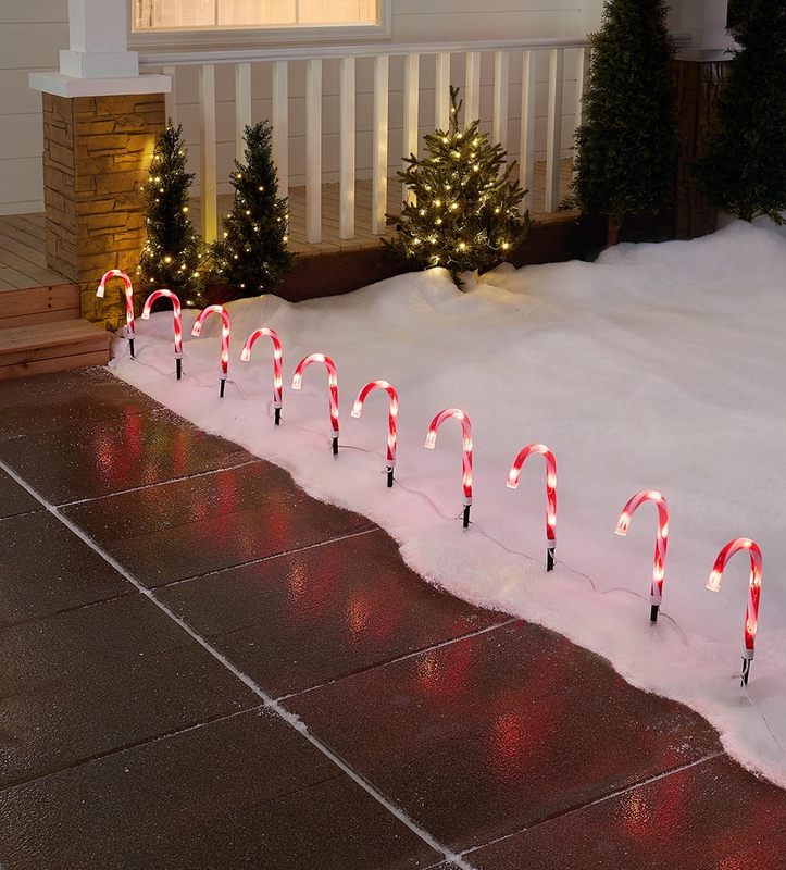 Holiday Time Indoor/Outdoor LED Light-Up Christmas Candy Cane Lawn Stakes, Red and White, 10 Count Includes 10 candy cane stakes with 40 LED lights End-to-end connectable with up to 90 sets Easy to assemble with included lawn stakes Perfect for lining walkways or gardens