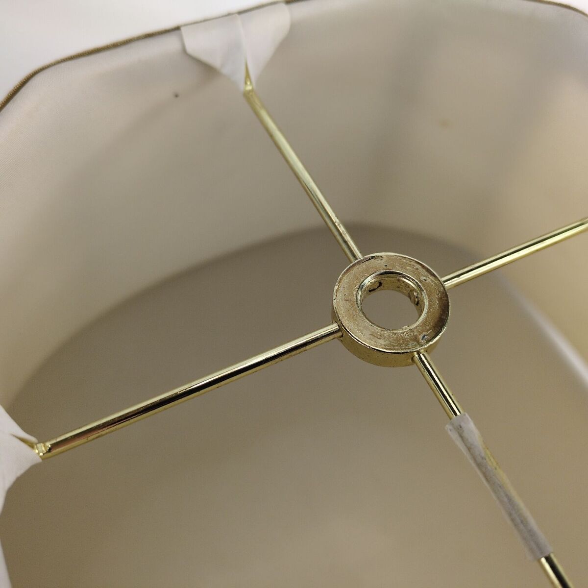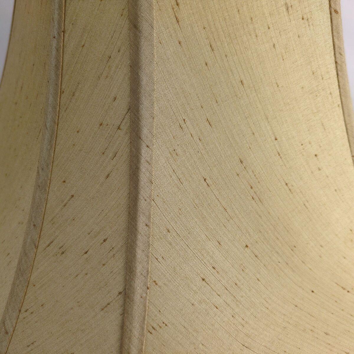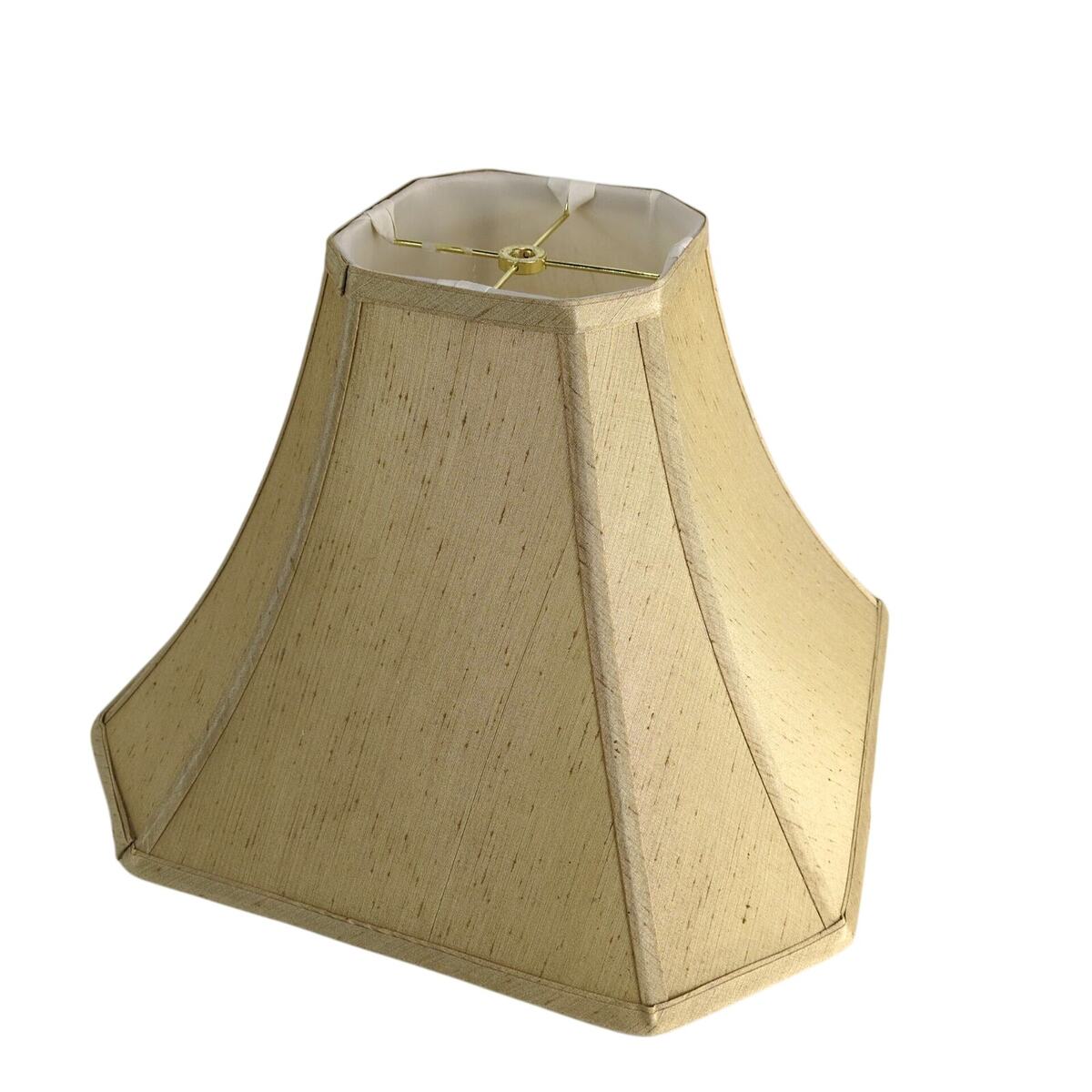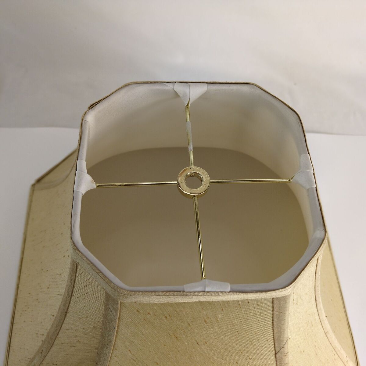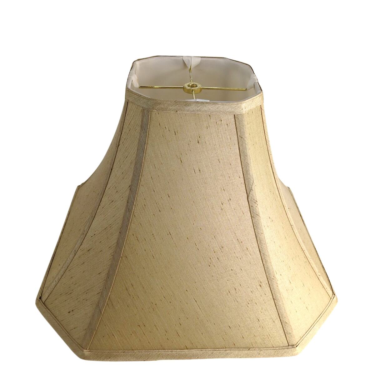 Elevate your home decor with this unique vintage lamp shade. Featuring an elegant octagon shape and a soft, brushed beige fabric with white inner lining. The top has a goldtone metal bracket with 1/2" diameter opening. This shade adds a touch of retro 60s-70s charm to any room!