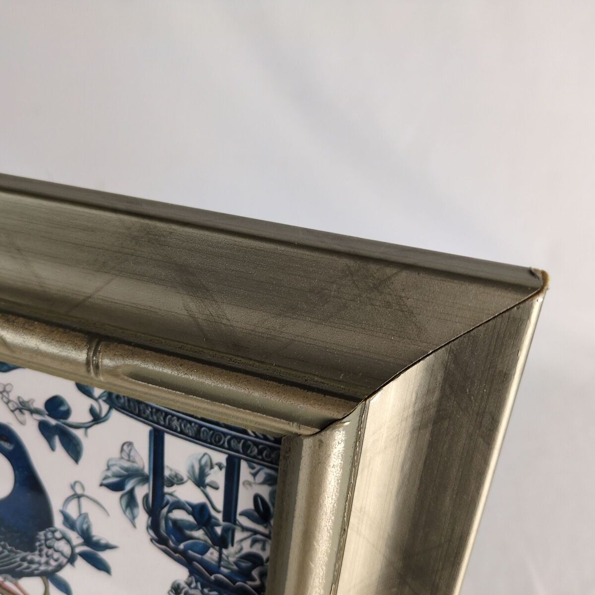 This mdf wood frame is by Burnes of Boston and features a golden-silver shade and bamboo shaped elements. The outside measures 13.25" by 11.25" with a 9.5" x 7.5" viewable window with glass. The backside has an easel as well as wall hooks. Currently holding a Chinoiserie style watercolor floral bird print which can be easily changed for artwork or photos of your preference.