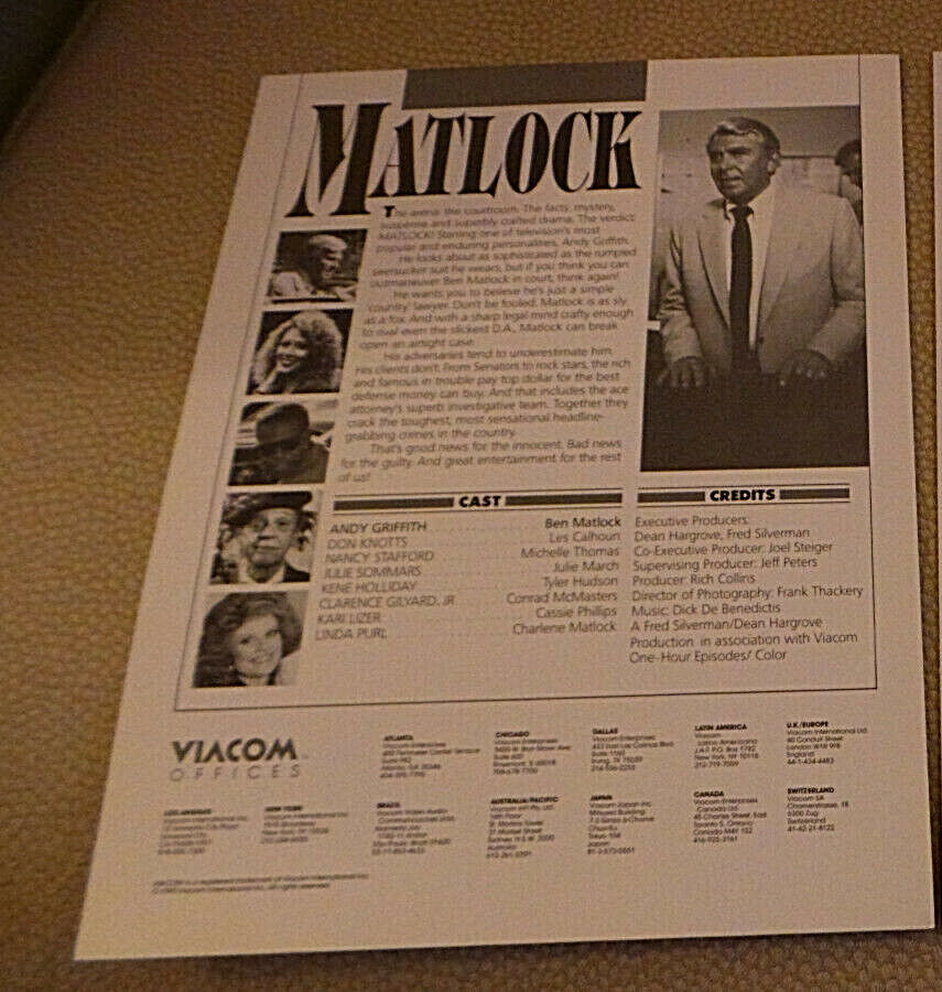 Viacom Promo Card featuring Andy Griffith for "Matlock" from 1990).