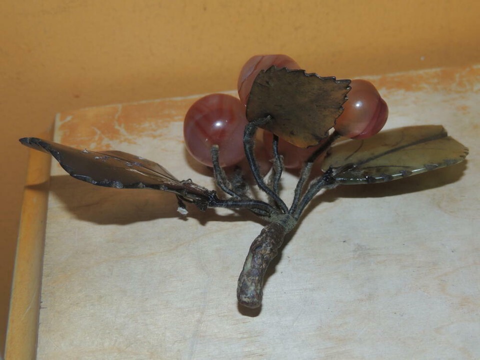 AGATE CHERRIES ON THE BRANCH, THE BRANCH IS DEFINITELY MAN MADE, BUT IT IS AN EXCELLENT REPLICA OF PETRIFIED WOOD. I AM NOT AN EXPERT BUT RESEARCH INDICATES THIS IS POSSIBLY CARNELIAN WITH GENUINE JADE LEAVES. PLEASE LOOK AT THE PICTURES CAREFULLY.