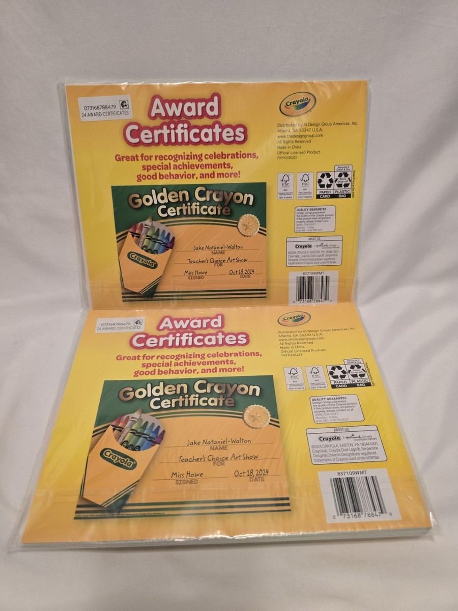 Crayola Golden Crayon Certificate Pack with 24 Award Certificates - Lot of 2