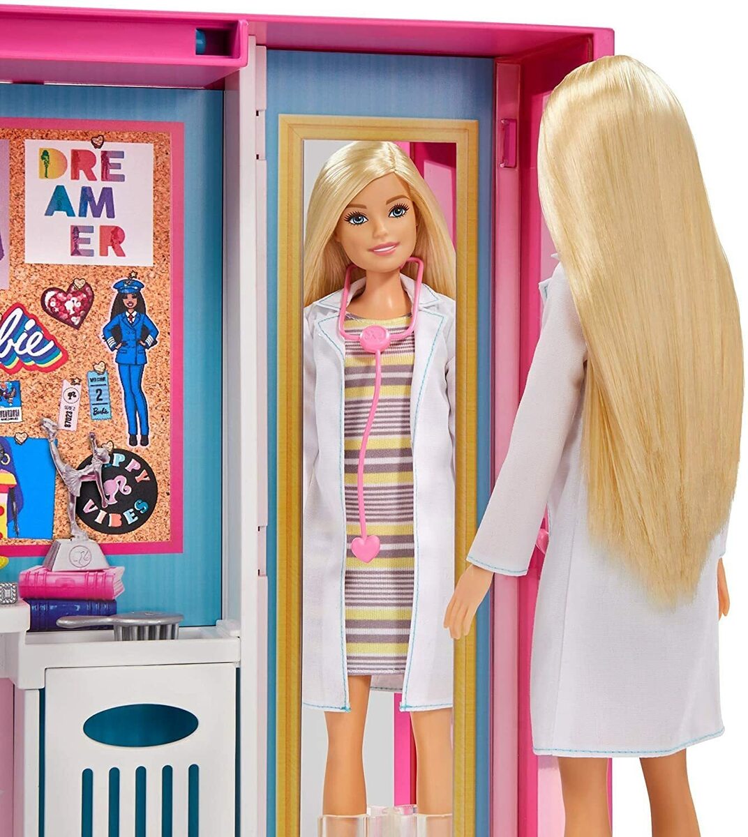 The Barbie Dream Closet inspires kids to create endless looks and stories to go with them! This modern pink closet opens to more than 2 feet wide (60+ cm), has more than 10 storage spaces and features a rotating clothing rack, full-length mirror and desk space. Barbie doll is included, along with more than 25 fashions and accessories. Store and display these pieces using the drawers, shelves and clothing racks. The rotating clothing rack really spins -just turn the knob to turn the rack and select an outfit. Kids can use the doll stand and mirror to style and model their looks; then use the desk space and accessories to play out sharing with friends. Kids can even customize the cork board above the desk with the included sticker sheet! The closet playset comes with four complete outfits, including accessories, for any occasion: a trendy day outfit, an evening look, a pediatrician outfit and a sporty scuba suit with mask and fins. Kids can also use the included sticker sheet to decorate the workspace. When playtime is over, pack up and close the closet to store or take on the go! A sleek carrying handle makes it easy to carry. Includes Dream Closet, Barbie doll wearing fashions and accessories and more than 25 pieces that include three additional looks and accessories. Doll cannot stand alone. Colors and decorations may vary.