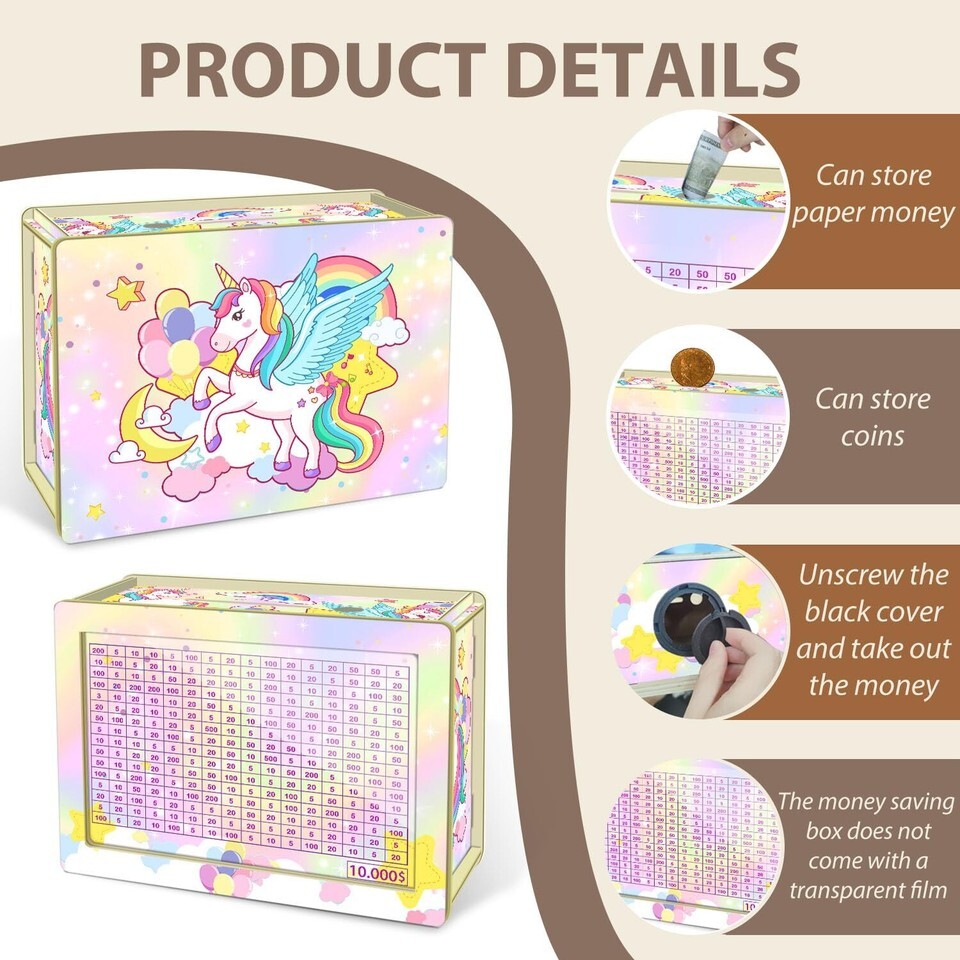 Our cash savings box adopts exquisite design and is decorated with lovely patterns. The design of the savings space meets the storage of the target amount. When you want to open the savings box to take out the cash, you only need to unscrew the black lid to take out the cash.