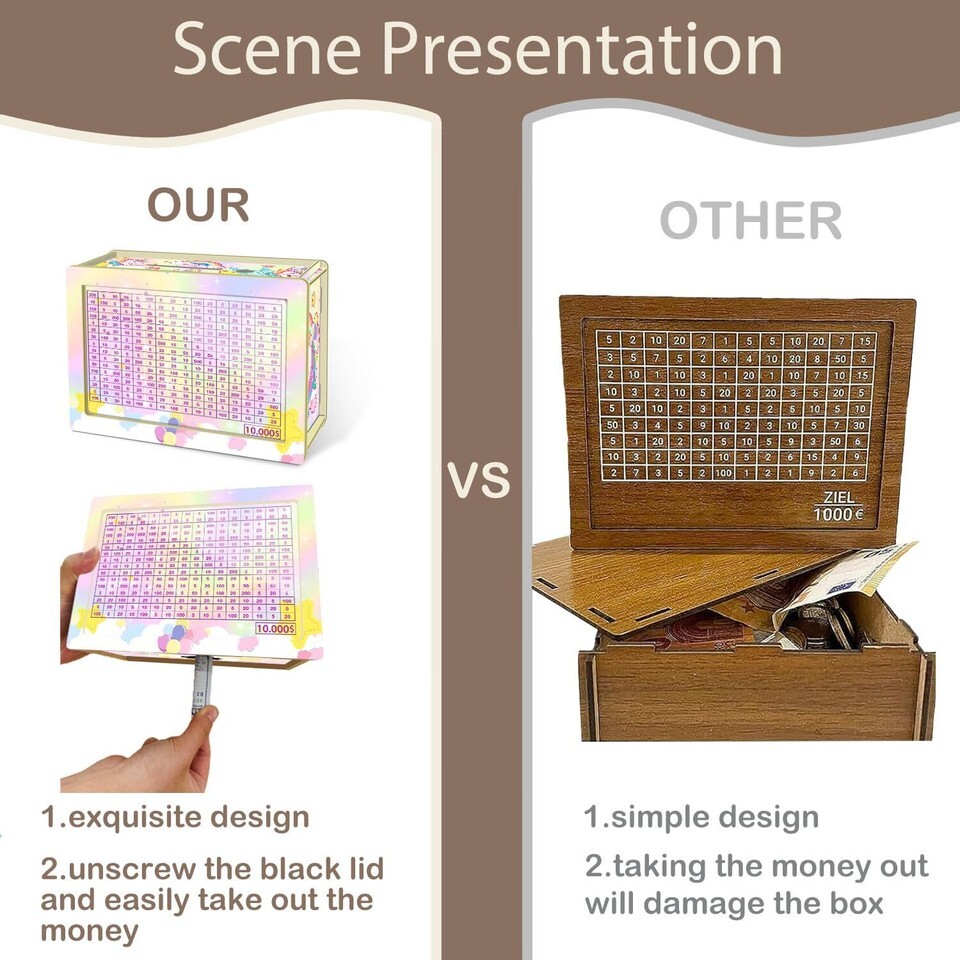 Exquisite Design: Different from other savings boxes, our money saving box are printed with exquisite patterns to meet the preferences of different people; each savings box has a fixed savings amount of US$10,000, and is designed with different amounts of savings for you to choose from. When you deposit money into the savings box, you can use a marker to mark the corresponding numbers for easy recording.