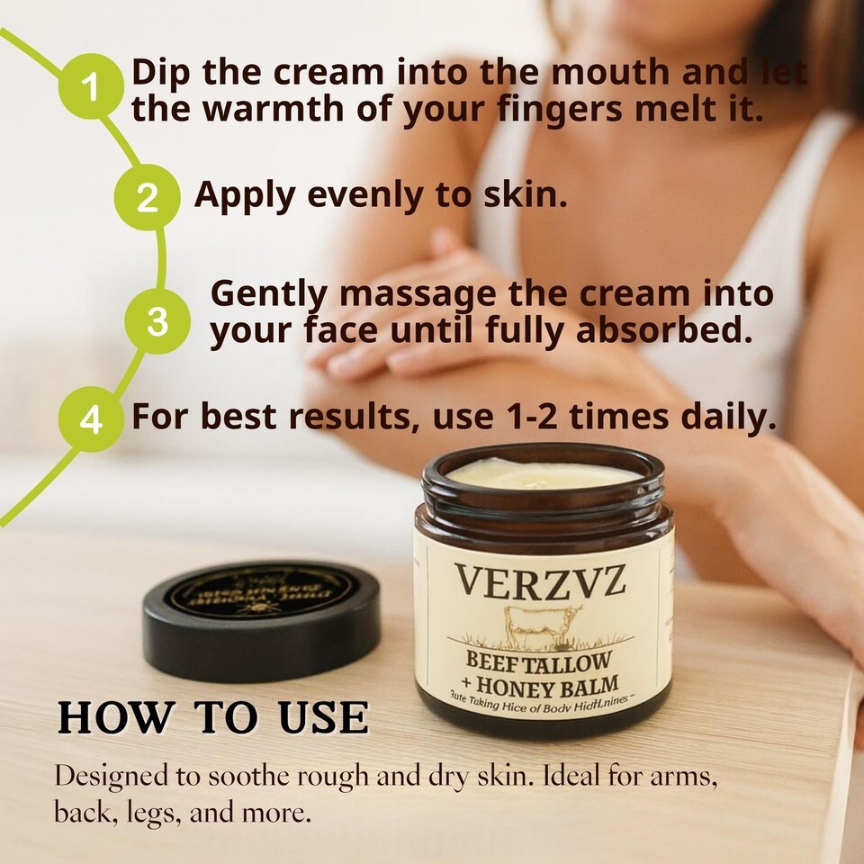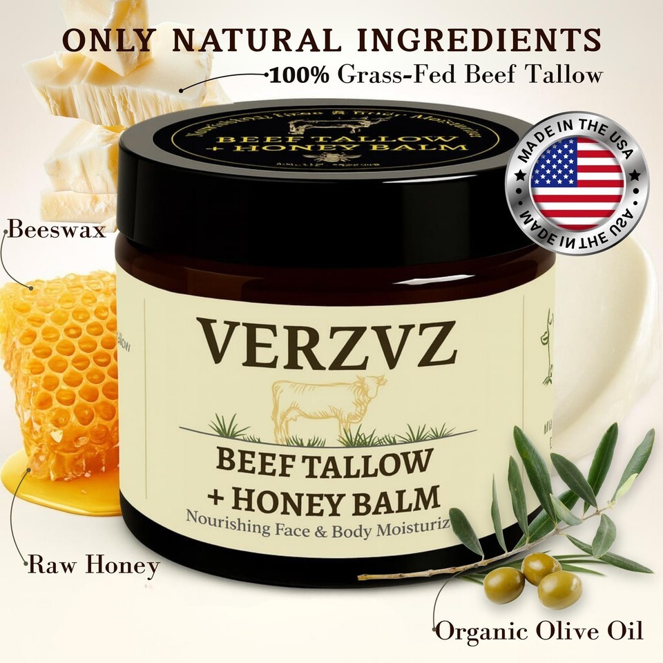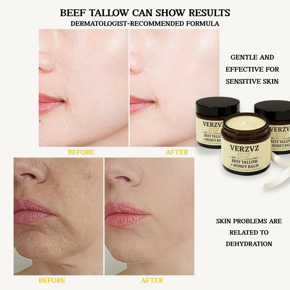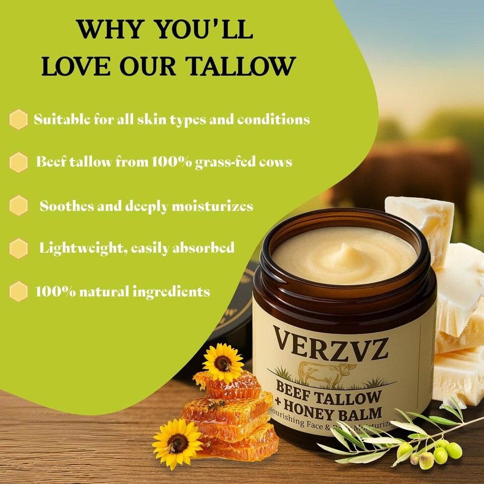 Hidratacion nutritiva profunda: sebo de res premium para la piel mezclado con miel cruda. Crea una humedad duradera para la cara y el cuerpo; apoya la barrera natural de la piel; hidratante facial de sebo ideal para todo tipo de piel.