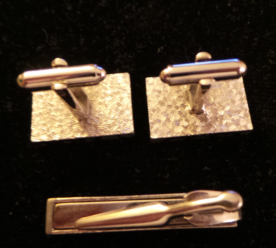 Vintage pair of Silvertone Black Silver Cuff Links and Tie Bar, 1960's-70's VG+