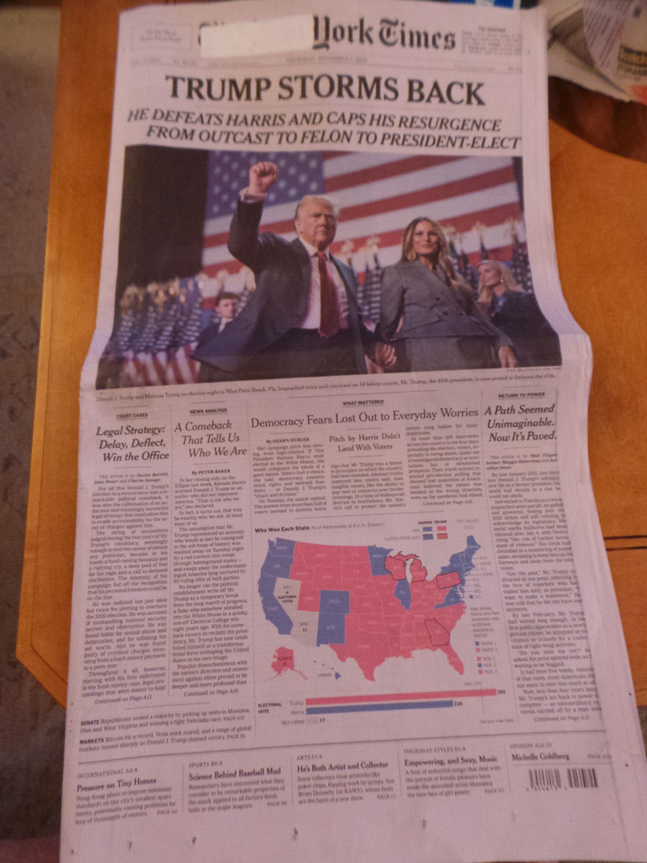 complete The New York Times Newspaper "A" section from November 7, 2024, "Donald Trump Storms Back" re-elected US president