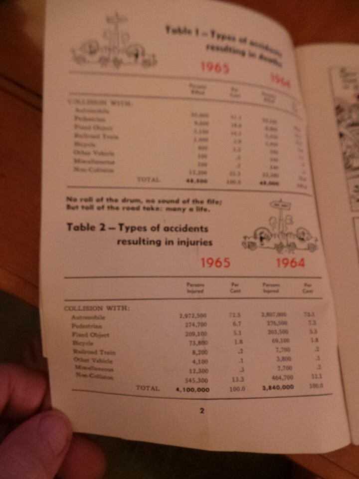1966 Travelers Insurance Booklet of Street Highway Accident Data "You Bet Your Life." Illustrated with serious but funny cartoon images amongst interesting accident data.