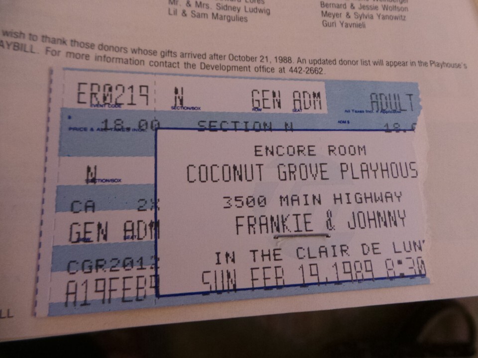 Playbill for "Frankie and Johnny in the Clair de Lune" Coconut Grove Playhouse Miami, Fl from February 1989 with ticket stub stapled on one of the back pages.VG