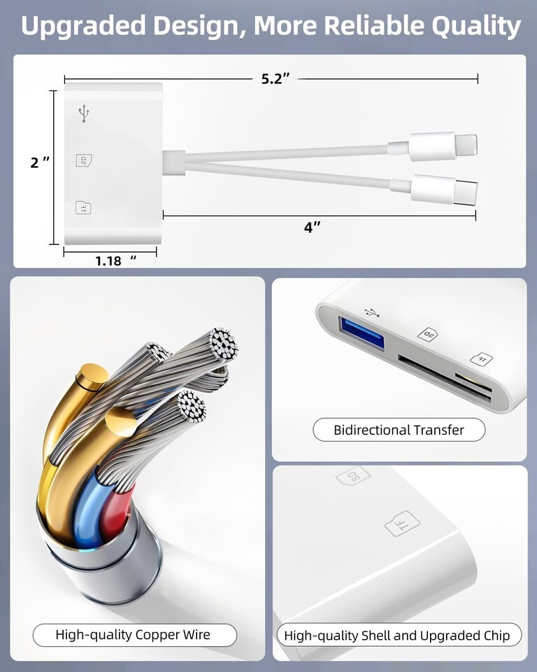 Two-way transfer: Supports two-way to stable transfer files/photos/music/video, from SD card to iphone/ipad or from iphone/ipad to memory cards. Ideal for photography creators, vlogger, photographers