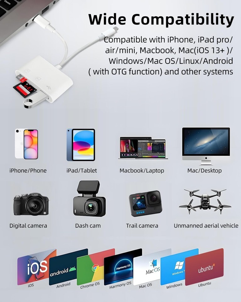 Wide compatibility: Compatible with iOS 13.0 or later/Windows/Mac OS/Linux/Android( with OTG function) and other systems, Storage accessories for digital photography equipment such as Canon/Nikon/Sony/Samsung/Kodak, memory storage converter for iPhone, iPad pro/air/mini, Macbook, Mac