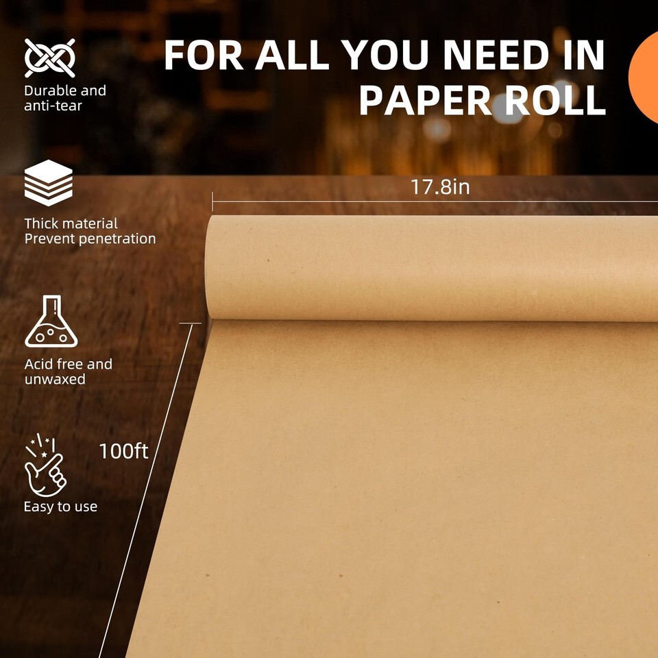 Endless Supply: Our kraft paper roll comes in a generous size of 17.8 inches wide and 1,200 inches (100 feet) long. It fits perfectly in an 18" paper roll dispenser/cutter and can be easily cut down to any size or shape you need. With this paper roll, you'll have an abundant supply of brown paper at your fingertips, ready to be used for any occasion.