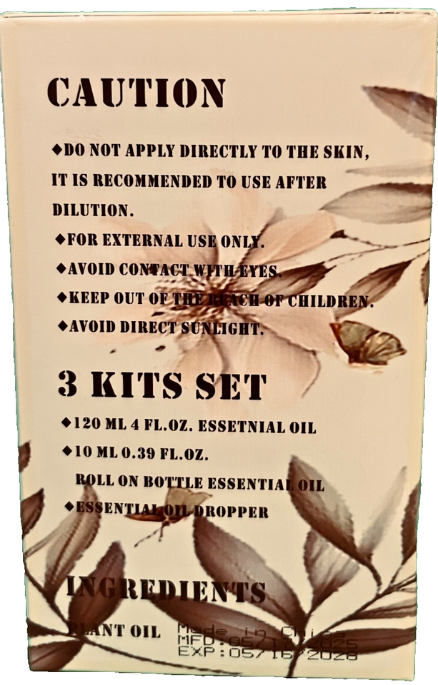 Each box kit has a bottle of 120 ml 4 fl oz Essential Oil, a 10 ml .39 fl oz Roll on Bottle Essential Oil and an Essential Oil Dropper