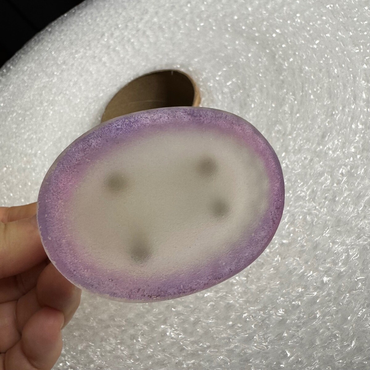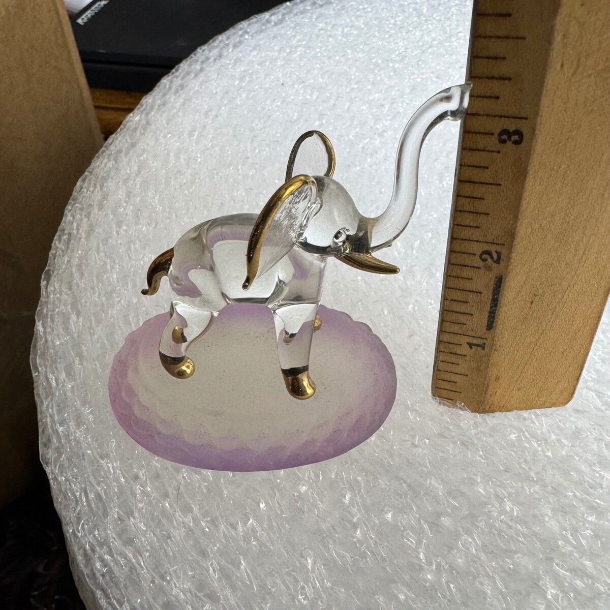 Keywords: glass elephant figurine, crystal elephant statue, gold accent elephant, purple frosted base, animal figurine, desk decor, shelf decor, decorative collectible, miniature elephant, elephant gift, animal statue, handmade glass, art glass