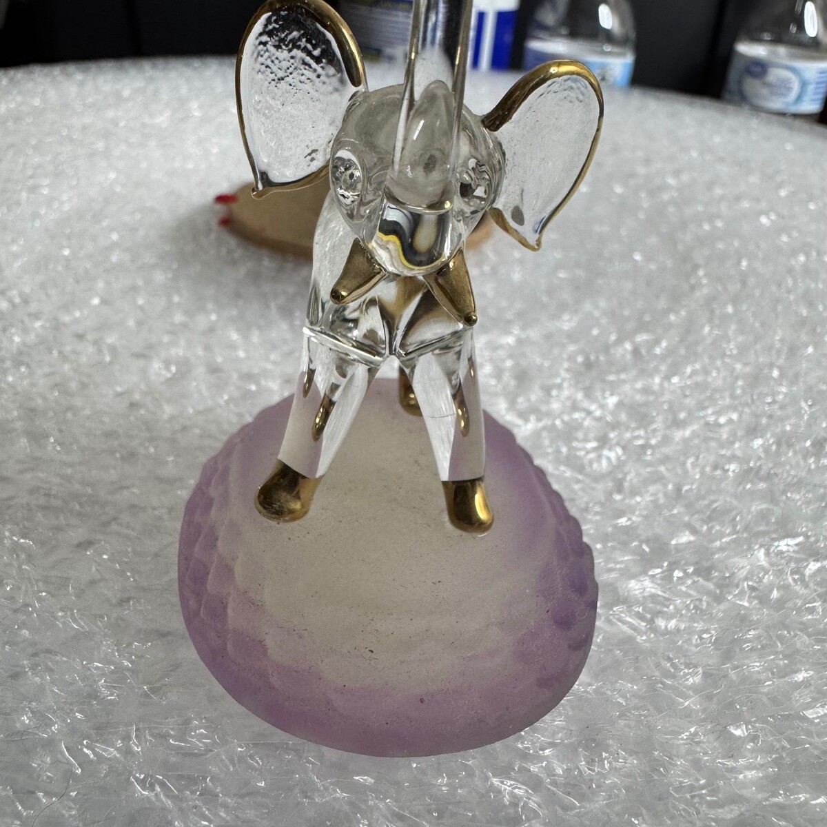 Vintage Clear Glass Elephant Figurine Gold Accents on Purple Frosted Glass Base