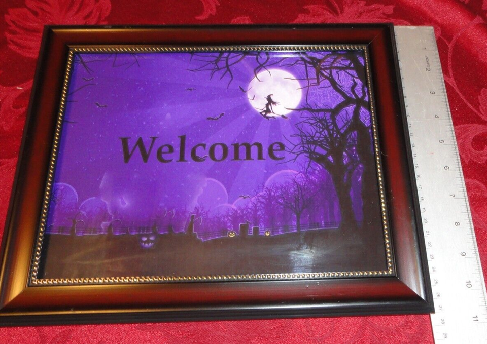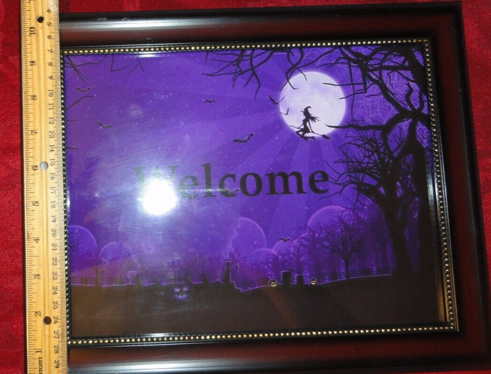 FRAMED PURPLE HALLOWEEN WITCH WELCOME PHOTO SIGN IN VINTAGE HQ FRAME 13"X11"