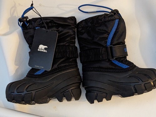 In vendita c'e un nuovo paio di stivali da neve invernali Sorel con etichetta, foderati blu neri, isolati, bambino 6 1831 SWL NUOVO.