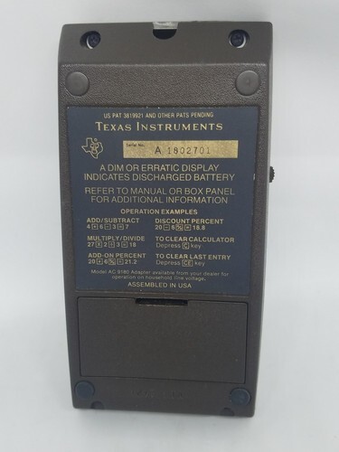 A vendre est une TI-1400 de travail vintage d'occasion Calculatrice Texas Instruments dans un boîtier marron. La calculatrice est propre et porte le numero de serie A1802701.