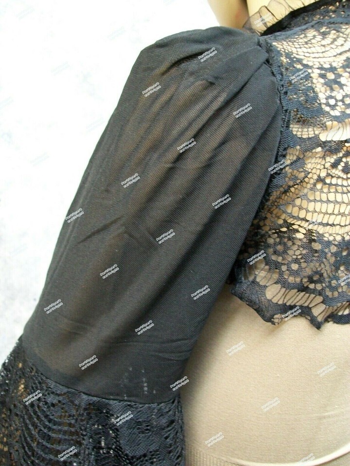 Black Lace with Thin Mesh Like Netting at the top of arms. This is a delicate piece. Pulling or overstretching the lace and material will cause damage. Looks like it would pick easily. I would use extreme caution putting this on with long fingernails. Extra Wide Bell Style Sleeves with neck fastening. Ends are different lengths to give it a tapered look. Shoulder seams have some small puffs of tulle like netting to give it a little puffiness there. Does have some longer threads that need trimmed here and there. For Adult Use. One Size Fits Most. Would fit smaller frames better. Smaller adults or teens. There is a little bit of elastic at the neck. I tried to measure and it looks like maximum neck size would be 15"