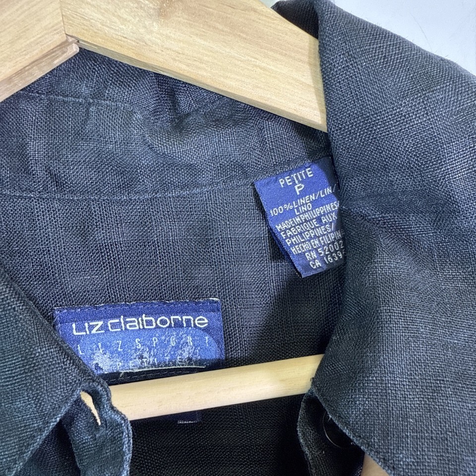 Women's petite small Vintage Liz Claiborne Irish linen button down shirt in a sheer black check. Button cuff with a slight ballon sleeve. In excellent vintage condition. Perfect staple piece.