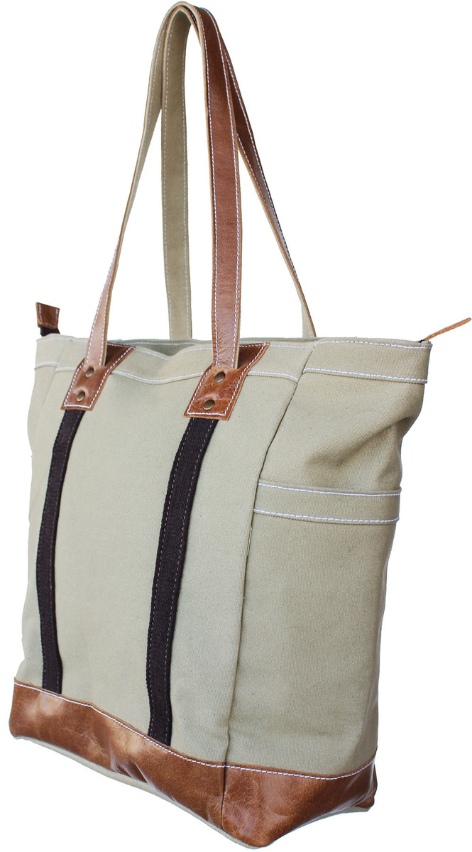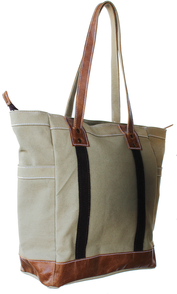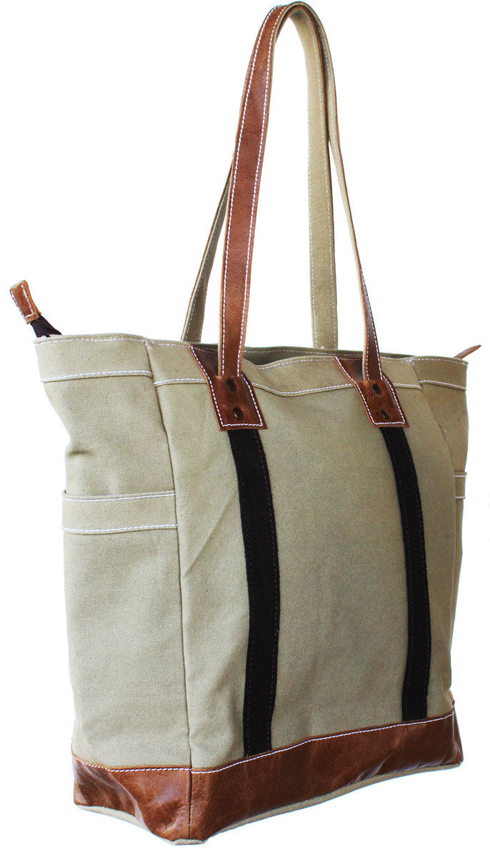 Challenger Women's water-resistant lightweight canvas tote shoulder bag with leather accents. Bags measure approximately 12" wide x 14" tall x 5.5" thick with a 9.5" drop. Features two outer pockets, a full closure zipper at the top, fully lined inside with two smaller pockets providing plenty of room for all of your essentials. Spot clean, air dry to remove stains.
