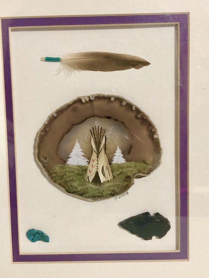 Vtg Native American Arrowhead Turquoise Feather Agate Hand Painted Framed Signed