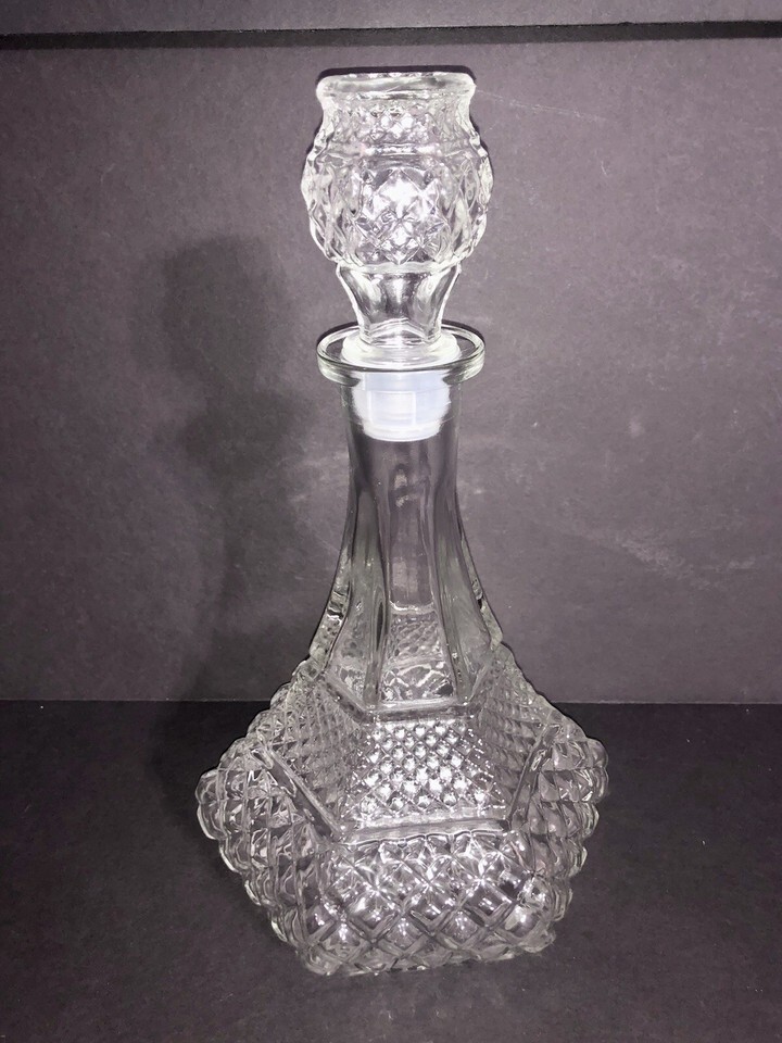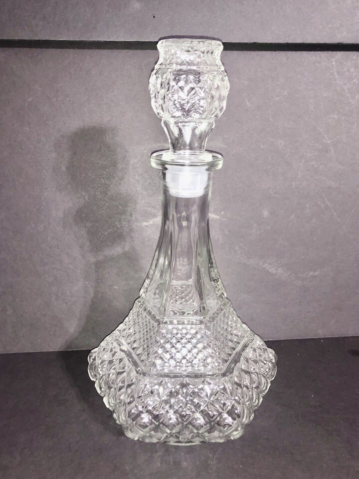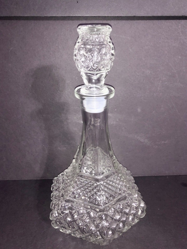 Vtg Anchor Hocking Wexford Clear Diamond Cut Chris Cross Ship Decanter & Stopper