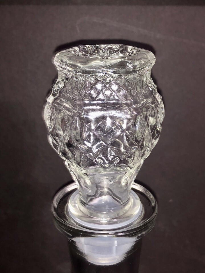 This product is a vintage Anchor Hocking Wexford clear diamond cut crystal decanter with a Chris cross design and stopper. Made of glass with a glossy finish, this original piece was produced in the United States in a cut glass production style. Standing at 11.5 inches tall, this collectible decanter from the Wexford product line is a stunning and elegant addition to any home bar or drinkware collection.