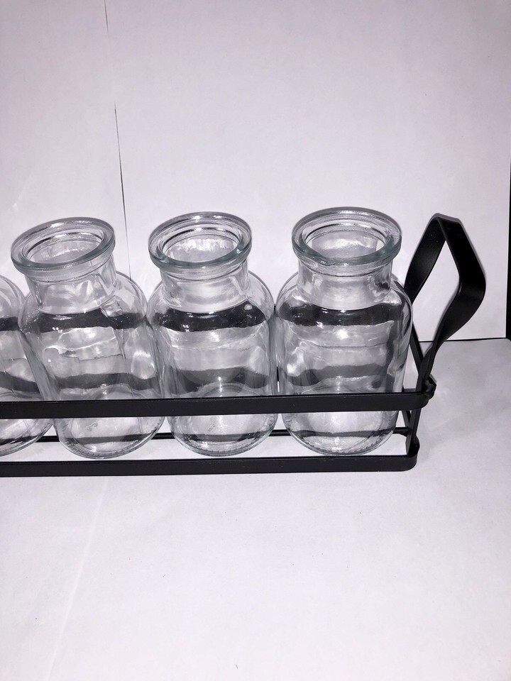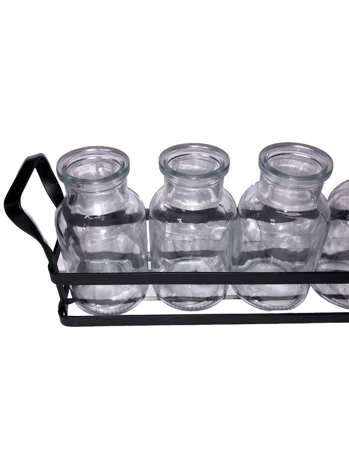 Set of 5 Glass Bottles Vases With Black Metal Stand Propagation Station NEW