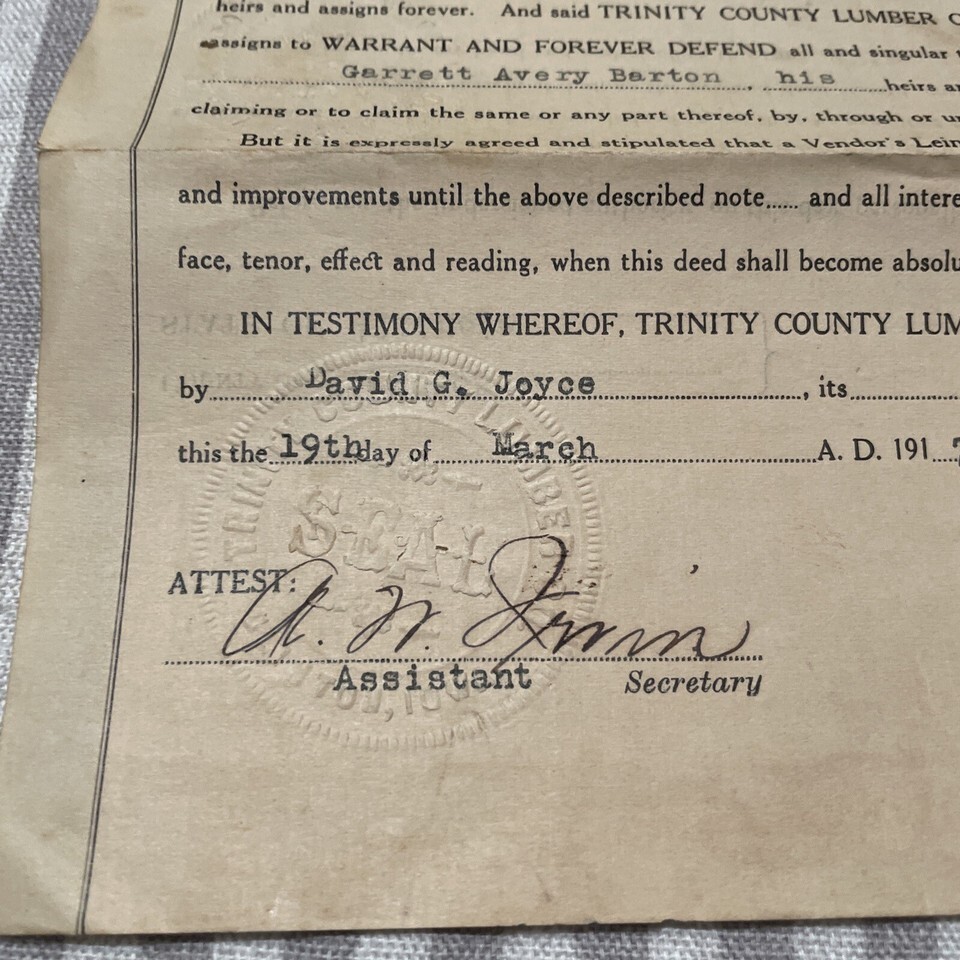 Trinity County Lumber Co Deed Of Sale 1917 signed David G Joyce