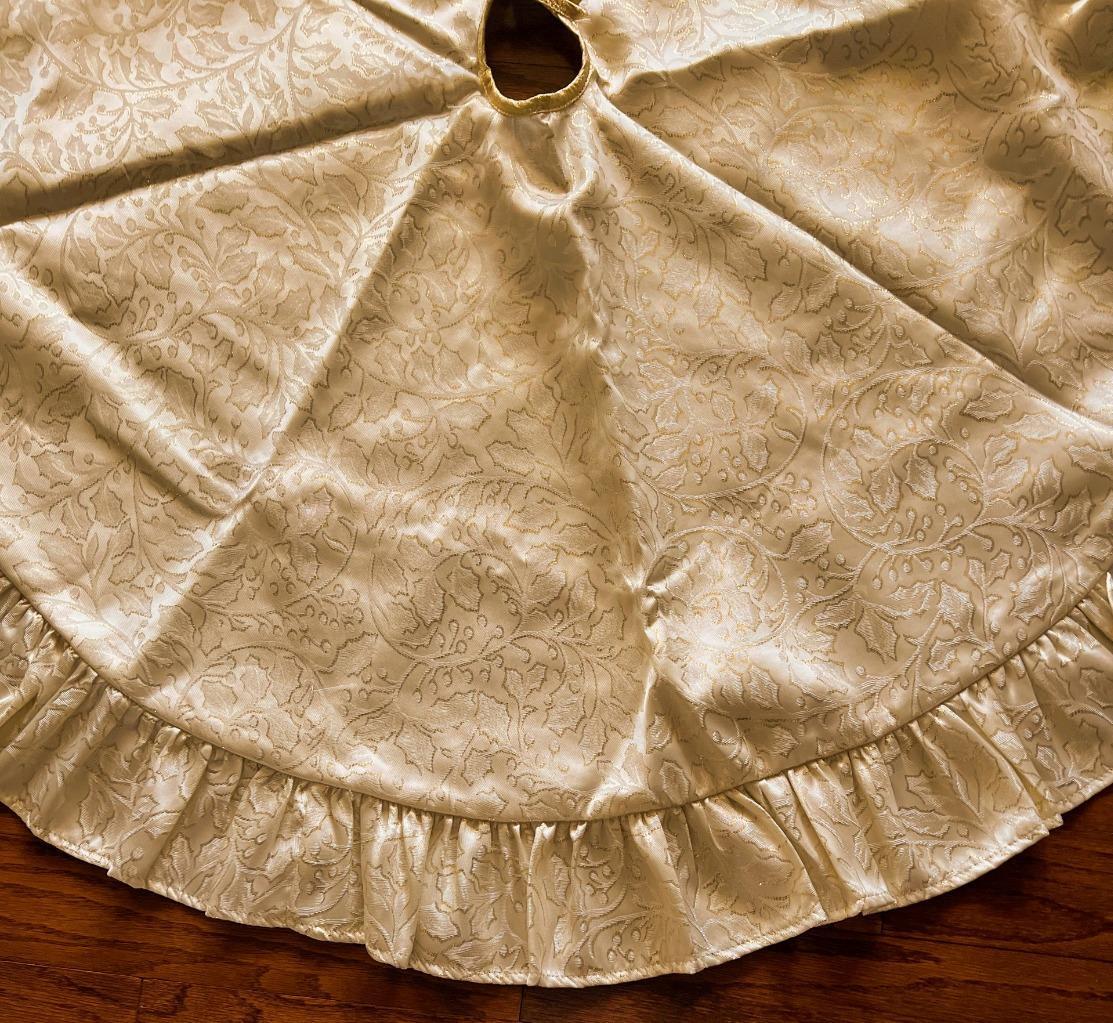 Christmas Tree Skirt 44" Cream & Gold Floral Brocade Metalic Thread Ruffled Edge
