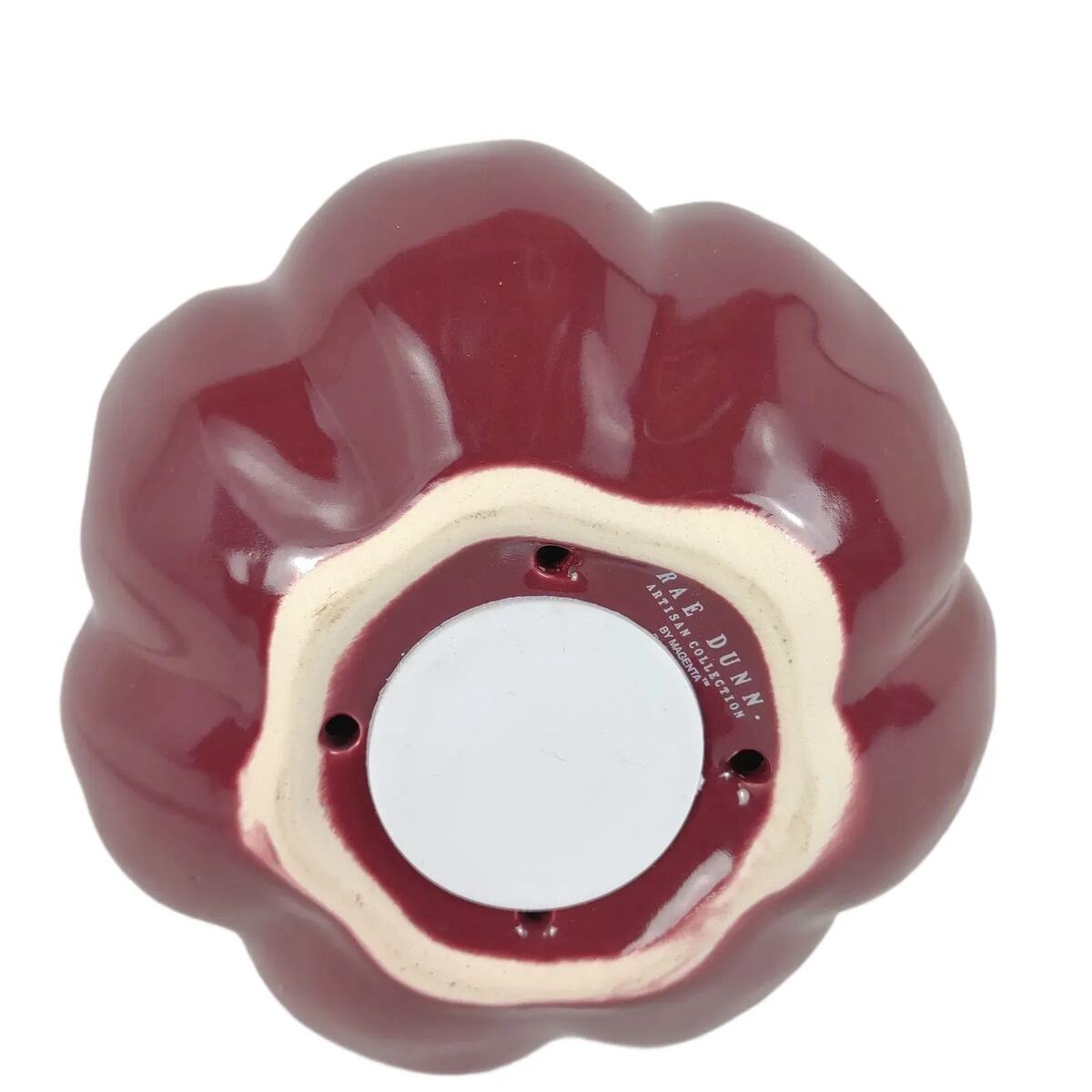 This charming ceramic birdhouse by Rae Dunn features a gourd shape in a burgundy purple shade with "Thankful" in gold lettering. There is a burlap ribbon on the top. The underside has vent holes and a removable plug. Measures 8-1/2" tall, 6" wide.