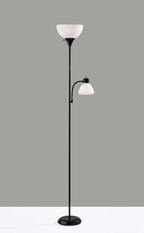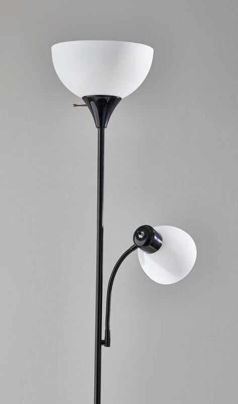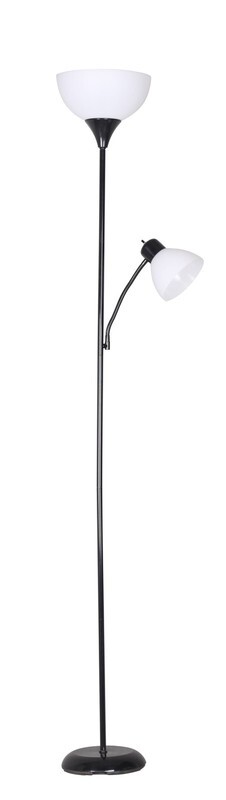 The Mainstays JK 1660BK combination floor lamp is two lamps in one, featuring a 100-watt main lamp with an additional 60-watt reading lamp (light bulbs not included). This sturdy yet slim 72" black plastic lamp includes an attached reading lamp with an adjustable gooseneck, two white color shades for a subtle ambient effect, and a 9" diameter plastic base. The main top light is controlled by a 3-way rotary switch and a simple on/off switch for the bonus reading lamp. The sleek and modern design makes this lamp a perfect addition to any living room, bedroom, or adult home office and a must-have for young adult college living spaces.