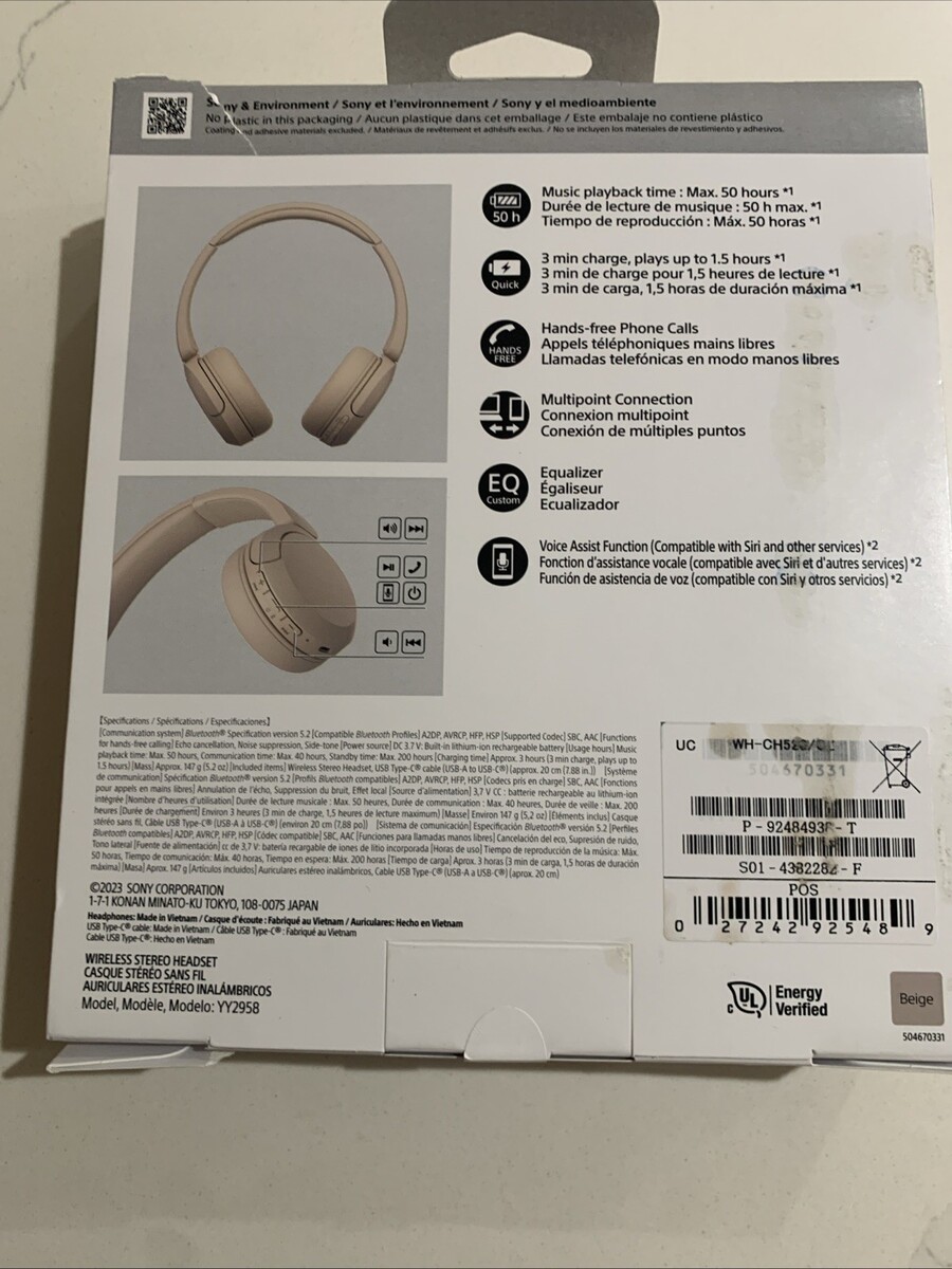 Sony WH-CH520 Wireless Bluetooth On-Ear Headphones Beige iOS & Android
