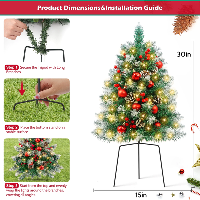 Unique Design: This 30-inch outdoor Christmas tree features layered PVC branches adorned with 10 pine cones, 5 glossy red ornaments, 5 matte red ornaments, and 10 berry garlands?bringing a rich, natural holiday look.