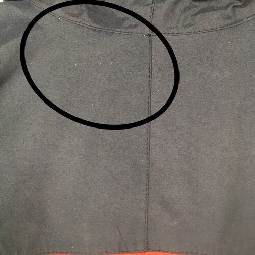 This is a very nice preowned jacket. Small spot on bottom left near tag white spots under hood on back. See pictures and item specifics for further details.