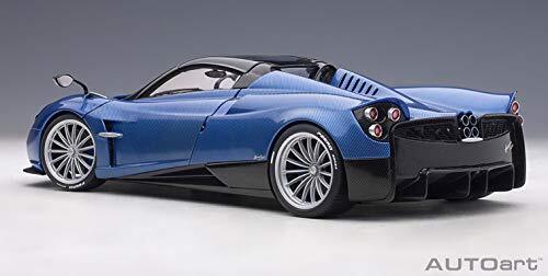 Product description: Brand new 1/18 scale car model of Pagani Huayra Roadster Blu Tricolore Carbon Fibre model car by Autoart. Brand new box. Real rubber tires. Has steerable wheels. This model is made of composite. Opening hood, doors, engine compartment. Detailed interior, exterior, engine compartment. Dimensions approximately L-10.5, W-4.5, H-2.25 inches.